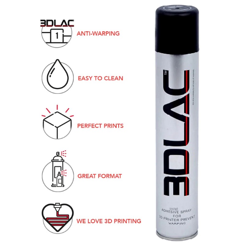 3DLAC is a 3D printing adhesive and is effective for most plastics and brands on the market. Used properly, 3DLAC keeps printed models securely attached to the printer surface. Spray 3DLAC from a distance of about 20 cm towards the center of the printer bed. A heated bed is recommended but not required for low shrinkage filament such as PLA or PETG. Once the print is completed and the printer bed has cooled, the print should detach easily.